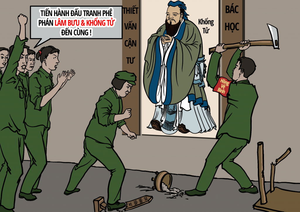 Khổng Tử đề xướng “Văn, Hành, Trung, Tín” bị Trung Cộng thóa mạ thành “Thầy của mọi lý luận cũ, linh hồn của thế lực ác”, còn nói “Từ khi có dân sinh đến nay, thực chưa từng có ai tội ác cực đại như Khổng Tử, là kẻ thù chung của đại đa số con người và những người lương thiện. Từ nay về sau nhân loại hãy cùng công kích nó, đúng thay! Từ cổ chí kim, từ trong ra ngoài, trong ngôn ngữ hành vi của mọi nhà tư tưởng, Khổng Khâu {Khổng Tử} có thể được coi là hoang đường nhất.”