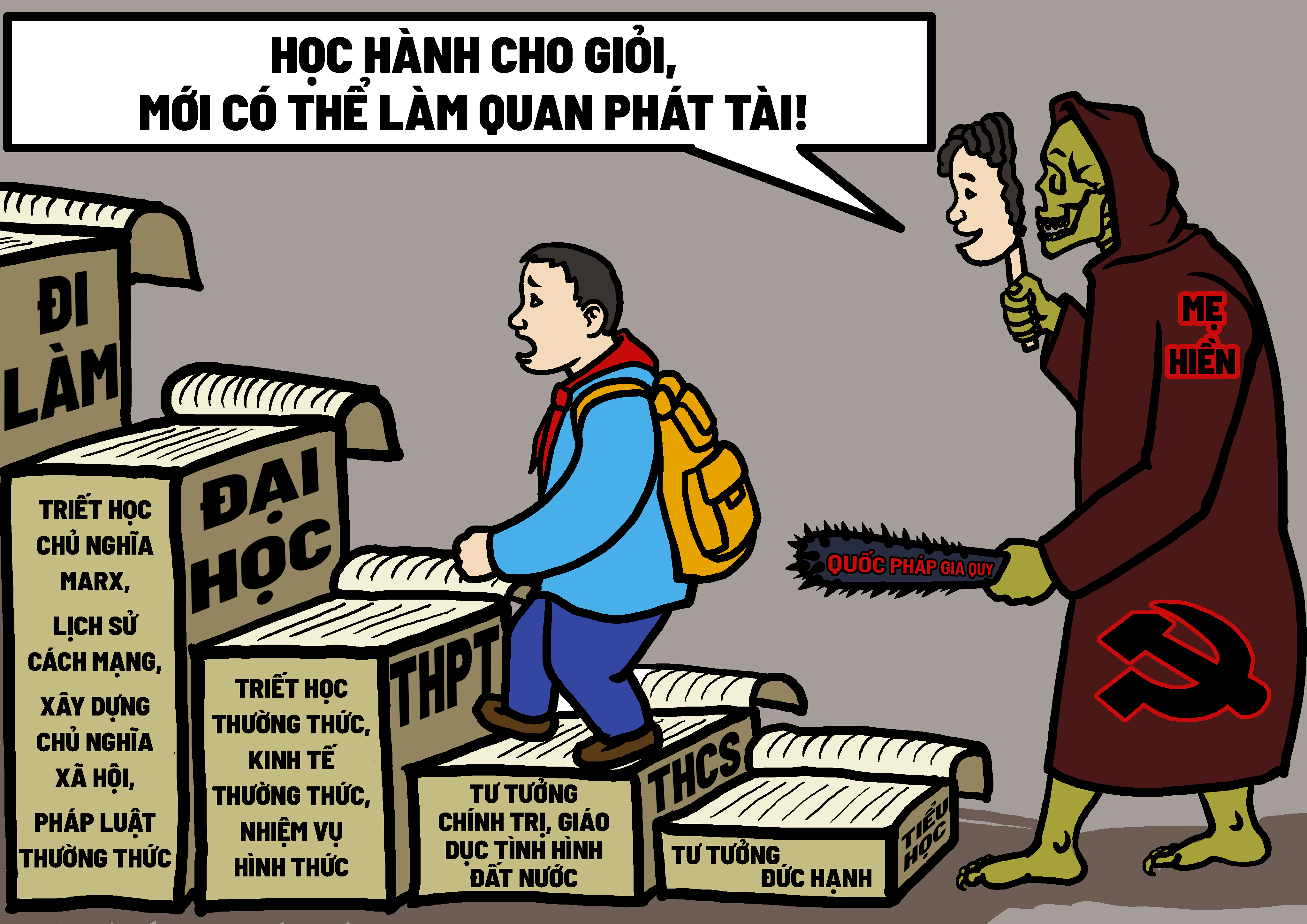 Từ tiểu học đến đại học (đây là cách nói khái quát, kỳ thực việc nhồi nhét bắt đầu từ nhà trẻ, một mạch cho tới tiến sĩ), học sinh của Trung Cộng luôn phải học ít nhất một môn chính trị, thời gian học thì dài, giáo trình thì nhiều, yêu cầu lại nghiêm ngặt, đúng là chuyện hiếm có tự cổ chí kim, trên phạm vi cả trong và ngoài nước.