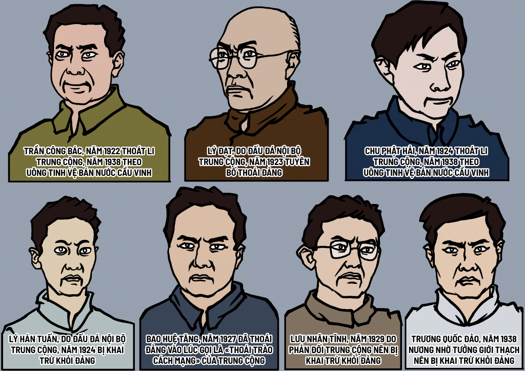 [1] Uông Tinh Vệ: Một chính trị gia thời Trung Hoa Dân Quốc. Ông ban đầu được biết đến là một thành viên của phe tả trong Quốc Dân đảng, nhưng về sau đã ngày càng trở nên chống cộng sau khi những nỗ lực thất bại của ông nhằm cộng tác với Đảng Cộng sản Trung Quốc. Hoạt động chính trị của ông đột ngột chuyển sang hữu sau đó, khi ông kết giao với người Nhật. Vì tham gia chính phủ thân Nhật, Uông thường bị gọi là Hán gian và tên của ông tại Trung Quốc trở thành một thuật ngữ dùng để ám chỉ kẻ phản bội.