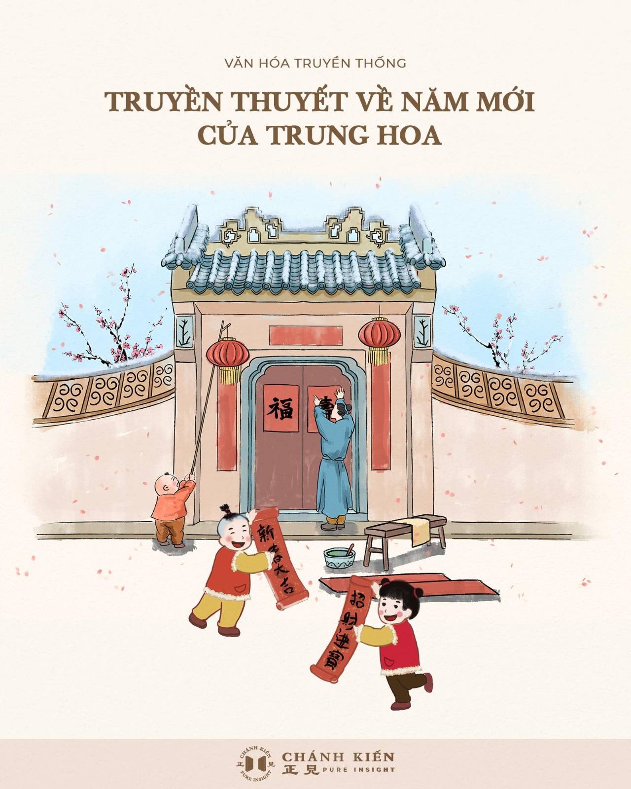 Truyền thuyết về năm mới của Trung Hoa. (Chú thích: 1/ Hai chữ dán trên cửa: Phúc và Thọ. 2/ Hai câu đối em bé cầm: 新春大吉 – Tân Xuân Đại Cát 招財進寶 – Chiêu Tài Tiến Bảo)