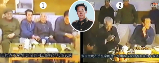Hình ảnh ở giữa là Trương Bảo Thắng mặc quân phục. Hình 1 từ trái sang phải: Ngũ Thiệu Tổ, Trương Bảo Thắng, Vương Chấn; Hình 2 hàng trước từ phải sang trái: Trương Bảo Thắng, Vương Chấn. Trong hình 2, Vương Chấn vỗ tay sau khi Trương Bảo Thắng lấy những viên thuốc ra khỏi lọ đã đóng kín. (Ảnh chụp tập thể sưu tầm trên mạng)