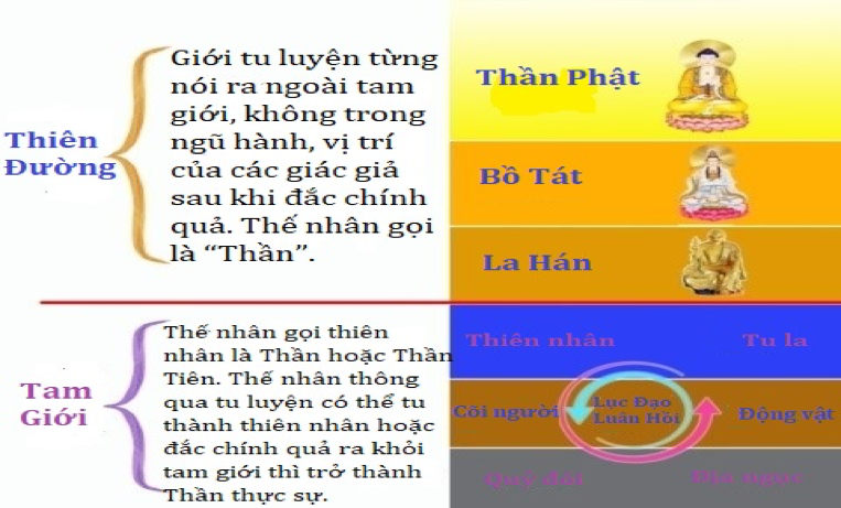 Tại sao con người phải tu luyện? Chính là để đề cao cảnh giới và tầng thứ của sinh mệnh.Phật gia là để tu thành Phật, Đạo gia để tu thành Đạo, còn Cơ Đốc giáo để tu thành Thần của thế giới Thiên quốc đối ứng với người phương tây. Phương pháp tu luyện và mức độ tinh tấn khác nhau quyết định sự khác biệt của quả vị cuối cùng mà người tu luyện chứng đắc được. Thông thường, nếu như tu tốt nhưng chưa đắc chính quả thì có thể lên đến tầng thứ thiên nhân ở thiên giới trong Tam giới, hưởng phúc phận làm Thần Tiên trong mấy trăm năm, khi hưởng hết tuổi trời thì lại nhập lục đạo luân hồi. Nếu như một người tu đắc chính quả thì có thể nhảy ra khỏi Tam giới, không tái nhập luân hồi nữa. Sau khi ra khỏi Tam giới, sinh mệnh tầng thứ nhất là La Hán, đều có thân hình nam; nếu tu tốt hơn một chút thì có thể tiến vào cảnh giới Bồ Tát, sinh mệnh của cảnh giới này đều có thân hình nữ, nếu như tu tốt hơn nữa thì có thể đạt đến cảnh giới của Phật, về hình tượng đều hiển hiện nguyên hình của mình. Cứ như vậy đến khi tu thành sinh mệnh cao cấp của cảnh giới cao hơn.
