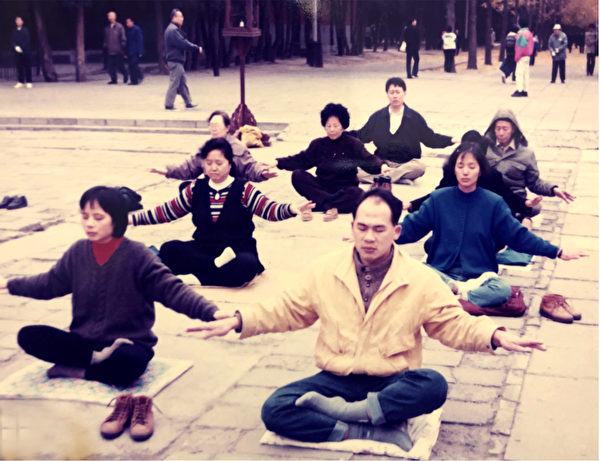 Sau khi tu luyện Pháp Luân Công, anh Lưu Hoàng Ảnh (người đầu tiên từ phải sang) đã tham gia Hội nghị Giao lưu Quốc tế Bắc Kinh vào tháng 10 năm 1996 và đến Công viên Thiên Đàn để luyện công cùng các học viên (Ảnh do NXB Bác Đại cung cấp).