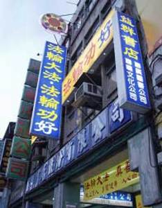 Ngoài cửa hiệu, biểu ngữ “Pháp Luân Đại Pháp – Pháp Luân Công hảo” được treo cạnh biển hiệu nằm ngang ở khu phố Đài Bắc nhộn nhịp.
