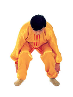 Hai tay vừa tháo khỏi trạng thái “hợp thập”, vừa hạ xuống phía chỗ bụng dưới, đồng thời xoay lòng bàn tay hướng vào thân thể. Bàn tay cách thân thể khoảng 10cm, vượt qua chỗ bụng dưới và duỗi xuống chỗ giữa hai chân, xuống theo mé trong hai chân, đồng thời khom lưng ngồi xuống, (như hình 4.1). Khi hai đầu các ngón tay gần chạm mặt đất, bàn tay từ chỗ đầu ngón chân, qua bên ngoài chân mà vạch một [vòng cung] bên ngoài ra phía sau chân (như hình 4.2).