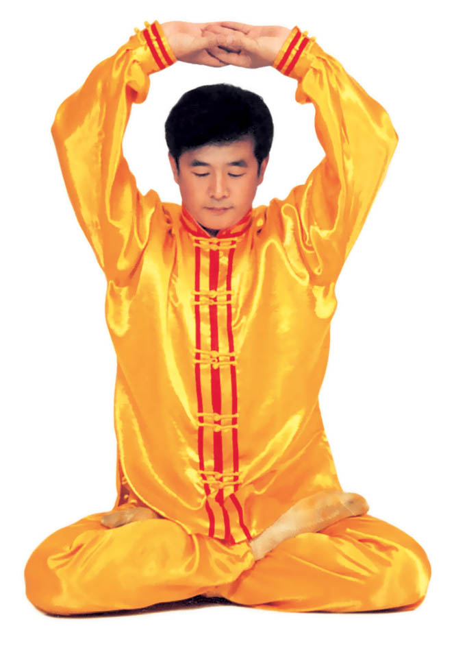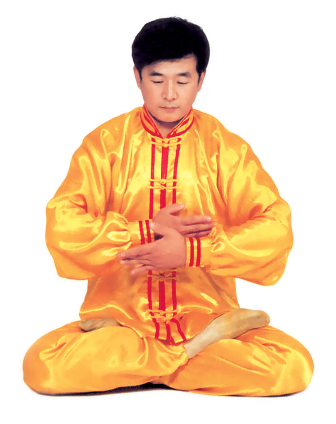 Tu luyện tĩnh công: Tiếp theo tư thế trên, sau đó, tay trên vạch một nửa hình tròn ra phía trước và rơi vào chỗ bụng dưới, hai tay trở thành trạng thái kết ấn (như hình 5.15), tiến nhập vào tu luyện tĩnh công. Nhập định, thời gian càng lâu càng tốt.