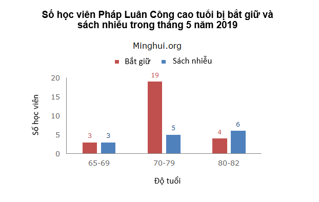 Số học viên bị sách nhiễu và bắt giữ trong tháng 5 năm 2019 (Màu cam: số học viên bị bắt giữ; màu xanh: số học viên bị sách nhiễu)